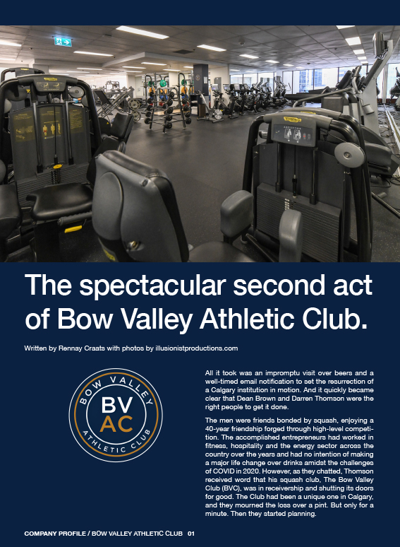 The men were friends bonded by squash, enjoying a 40-year friendship forged through high-level competition. The accomplished entrepreneurs had worked in fitness, hospitality and the energy sector across the country over the years and had no intention of making a major life change over drinks amidst the challenges of COVID in 2020. However, as they chatted, Thomson received word that his squash club, The Bow Valley Club (BVC), was in receivership and shutting its doors for good. The Club had been a unique one in Calgary, and they mourned the loss over a pint. But only for a minute. Then they started planning.