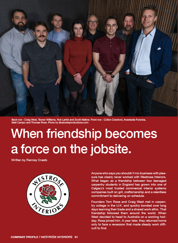 Anyone who says you shouldn’t mix business with pleasure has clearly never worked with Westrose Interiors. What began as a friendship between two teenaged carpentry students in England has grown into one of Calgary’s most trusted commercial interior systems companies built on grit, craftsmanship and a relentless commitment to delivering on schedule.